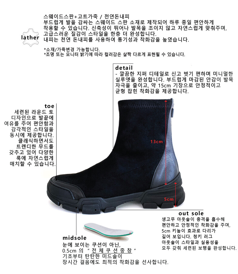 COMMENT 스웨이드 스판소제로 제작되어 발목을 자연스럽게~ 생고무창의 아웃솔과 뒤쪽 깔끔한 지퍼디테일로 유니크한 스니커즈 부츠를 소개해드려요! 부드럽게 발을 감싸는 스웨이드 스판 소재로 제작되어 하루 종일 편안하게 착용할 수 있습니다. 신축성이 뛰어나 발목을 조이지 않고 자연스럽게 맞춰주며, 고급스러운 질감이 스타일을 한층 더 완성합니다. 내피는 천연 돈내피를 사용하여 통기성과 착화감을 높였습니다. 세련된 라운드 토 디자인으로 발끝에 여유를 주어 편안함과 감각적인 스타일을 동시에 제공합니다. 클래식하면서도 트렌디한 무드를 갖추고 있어 다양한 룩에 자연스럽게 매치할 수 있습니다. 뒷라인에 더해진 깔끔한 지퍼 디테일로 신고 벗기가 간편하며 군더더기 없는 미니멀한 실루엣을 완성합니다. 안감까지 부드럽게 마감되어 발목에 자극 없이 하루 종일 안정적인 착화감을 느낄 수 있으며, 총기장(굽 제외 약 15cm)으로 발목을 안정적으로 감싸 균형 잡힌 실루엣을 연출합니다. 편안함의 핵심은 생고무 아웃솔로, 충격을 효과적으로 흡수하여 발의 피로도를 줄이고 미끄럼 방지 기능까지 더해 안정적인 보행을 완성합니다. 4cm 겉굽과 1cm 속굽이 더해진 총 5cm의 키높이 효과로 다리가 한층 길어 보이며 자연스럽고 세련된 비율을 만들어줍니다. 도톰하고 입체적인 청키 러그 아웃솔은 안정적인 착화감을 제공함과 동시에 스타일리시한 포인트가 되어 다양한 환경에서 자신감 있는 보폭을 선사합니다.