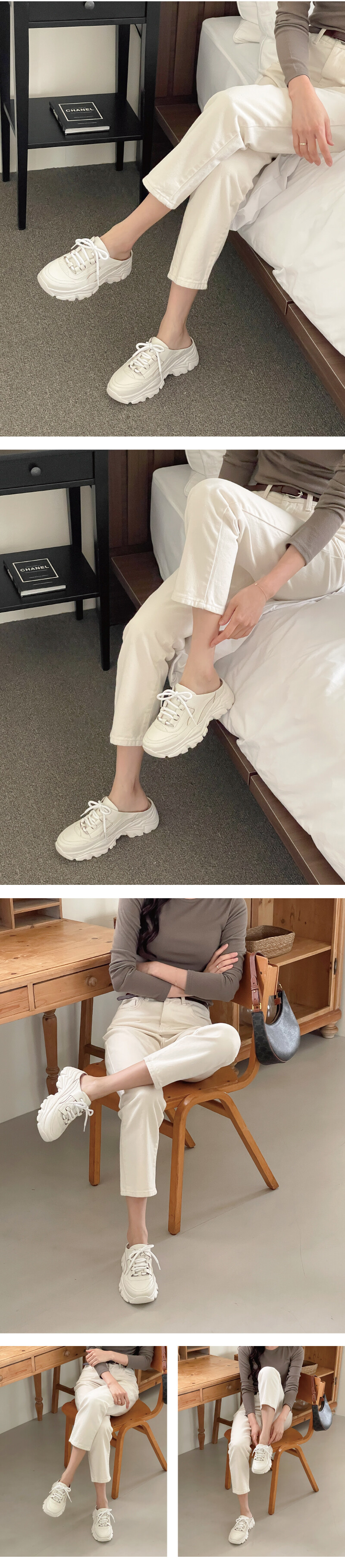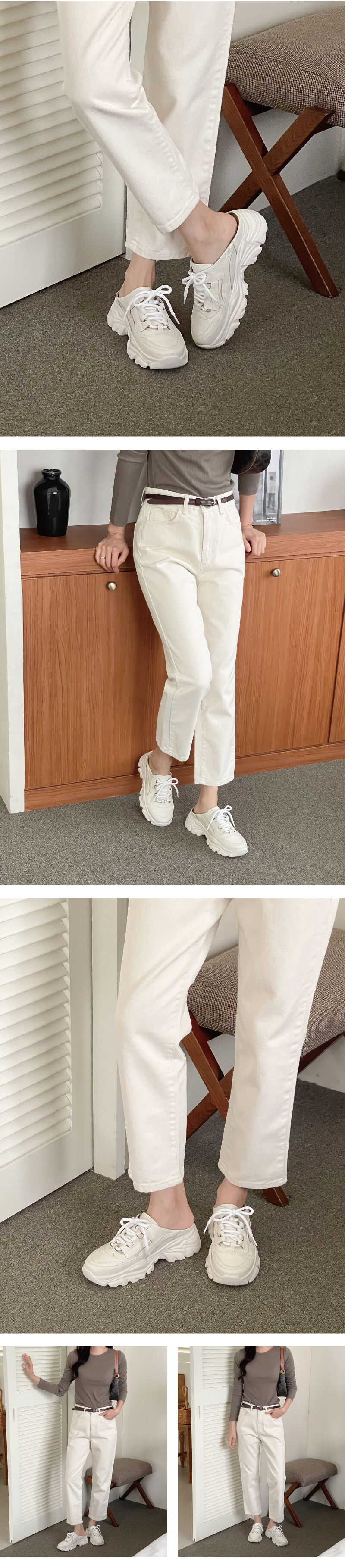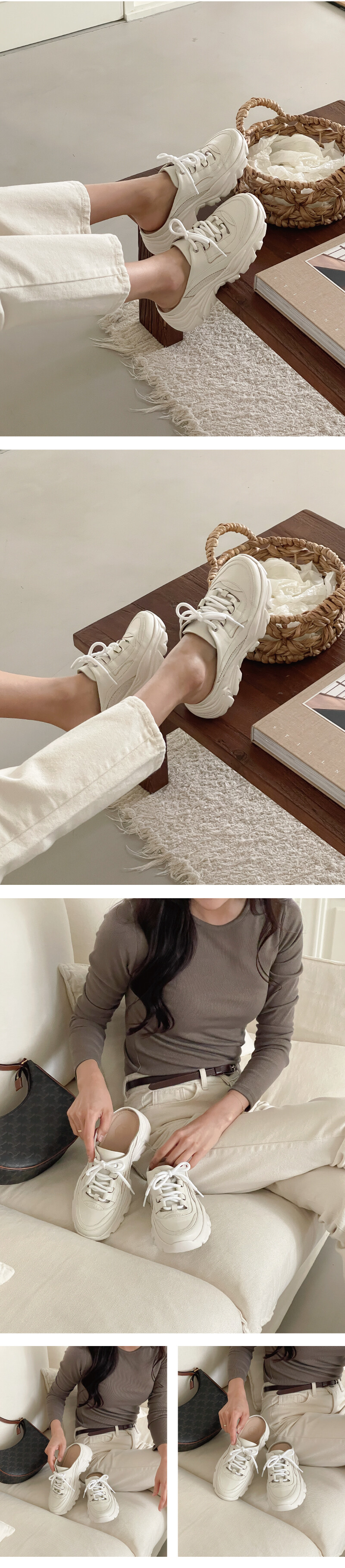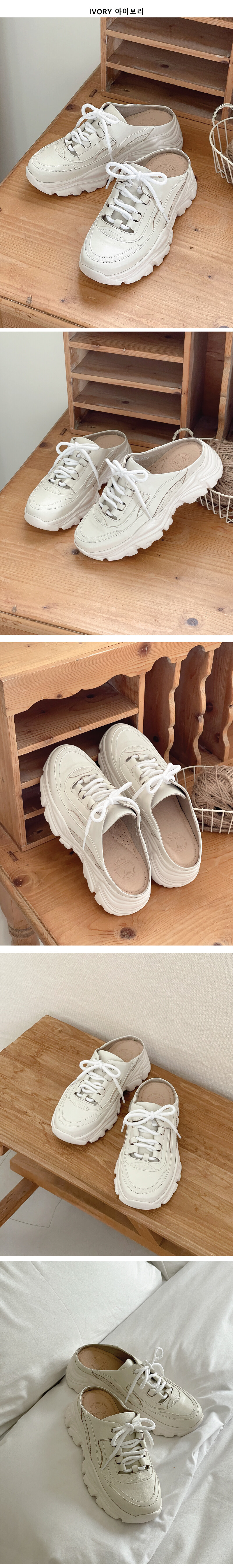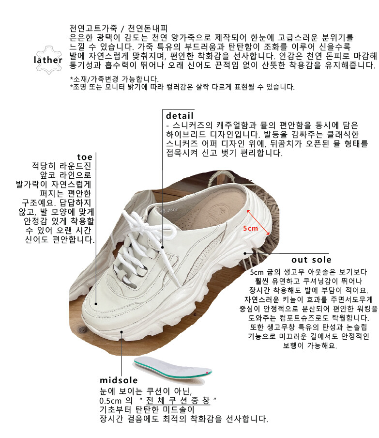 COMMENT 이 신발은 스니커즈의 캐주얼함과 뮬의 편안함을 동시에 담은 하이브리드 디자인입니다. 발등을 감싸주는 클래식한 스니커즈 어퍼 디자인 위에, 뒤꿈치가 오픈된 뮬 형태를 접목시켜 신고 벗기 편리합니다. 전체적으로 부드러운 크림 톤의 가죽 소재를 사용해 고급스러우면서도 데일리로 매치하기 좋은 분위기를 줍니다. 특히, 웨이브 패턴이 들어간 두꺼운 아웃솔은 구름 위를 걷는 듯한 폭신한 착화감을 상징하면서, 트렌디한 플랫폼 실루엣을 강조해 키높이 효과까지 제공합니다. 스니커즈의 활동성과 뮬의 간편함을 결합한 디자인으로, 꾸안꾸(꾸민 듯 안 꾸민 듯) 스타일을 완성하기에 제격입니다. 은은한 광택이 감도는 천연 양가죽으로 제작되어 한눈에 고급스러운 분위기를 느낄 수 있습니다. 가죽 특유의 부드러움과 탄탄함이 조화를 이루어 신을수록 발에 자연스럽게 맞춰지며, 편안한 착화감을 선사합니다. 안감은 천연 돈피로 마감해 통기성과 흡수력이 뛰어나 오래 신어도 끈적임 없이 산뜻한 착용감을 유지해줍니다. 적당히 라운드진 앞코 라인으로 발가락이 자연스럽게 펴지는 편안한 구조예요. 답답하지 않고, 발 모양에 맞게 안정감 있게 착용할 수 있어 오랜 시간 신어도 편안합니다. 5cm 굽의 생고무 아웃솔은 보기보다 훨씬 유연하고 쿠셔닝감이 뛰어나 장시간 착용해도 발에 부담이 적어요. 자연스러운 키높이 효과를 주면서도무게 중심이 안정적으로 분산되어 편안한 워킹을 도와주는 컴포트슈즈로도 탁월합니다. 또한 생고무창 특유의 탄성과 논슬립 기능으로 미끄러운 길에서도 안정적인 보행이 가능해요.