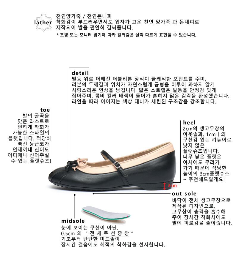 COMMENT 슈즈는 둥근 듯 유니크한 앞코 라인과 더블리본, 발등 스트랩, 그리고 색 조합이 세련된 감성을 주는 디자인의 플랫을 소개해드려요! 부드럽고 유연한 양가죽으로 제작되어 발에 자연스럽게 감기며, 가볍고 고급스러운 질감이 돋보입니다. 얇고 매끄러운 표면은 발의 움직임에 따라 자연스러운 주름을 만들어내며, 시간이 지나도 부드러운 촉감이 유지됩니다. 발의 굴곡을 맞춘 라스트로 편하게 착화가 가능한 스타일의 플랫입니다. 적당히 빠진 둥근코가 언제꺼내 신어도 어디에나 신어주실 수 있는 플랫슈즈입니다. 발등 위로 더해진 더블리본 장식이 클래식한 포인트를 주며, 리본의 두께감과 위치가 자연스럽게 균형을 이루어 과하지 않게 사랑스러운 인상을 남깁니다. 얇은 스트랩은 발등을 안정감 있게 잡아주며, 콤비 컬러 배색이 들어가 흔하지 않은 감각을 완성했습니다. 라인을 따라 이어지는 색상 대비가 세련된 구조감을 강조합니다. 바닥이 전체 생고무창으로 제작된 디자인으로, 고무창이 충격을 흡수해 주어 장시간 착화시에도 발에 피로감을 줄여줍니다. 2cm의 생고무창의 아웃솔과, 1cm의 쿠션감 있는 키높이로 낮지 않은 플랫슈즈입니다. 너무 낮은 플랫은 아치에도 무리가 가기 때문에 적당한 높이의 3cm플랫슈즈입니다.