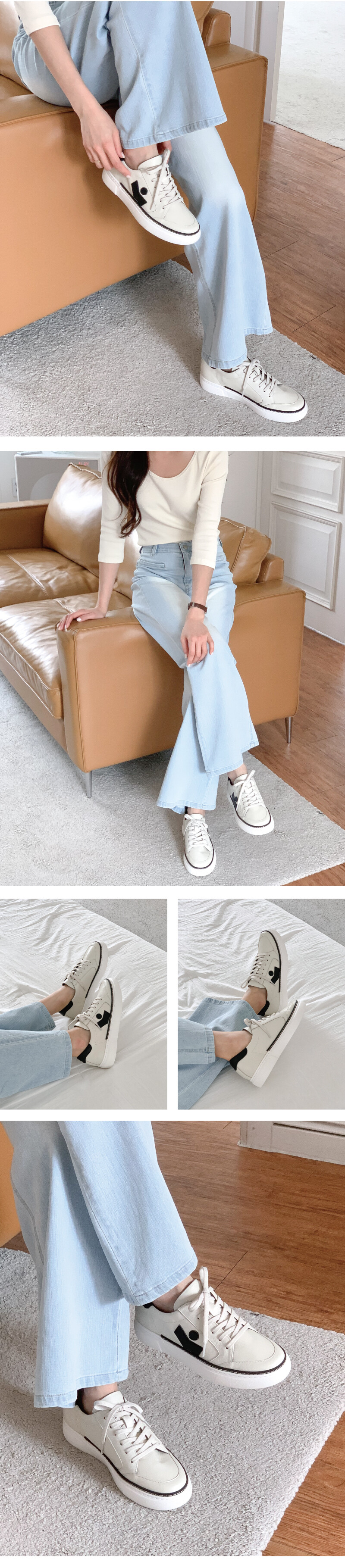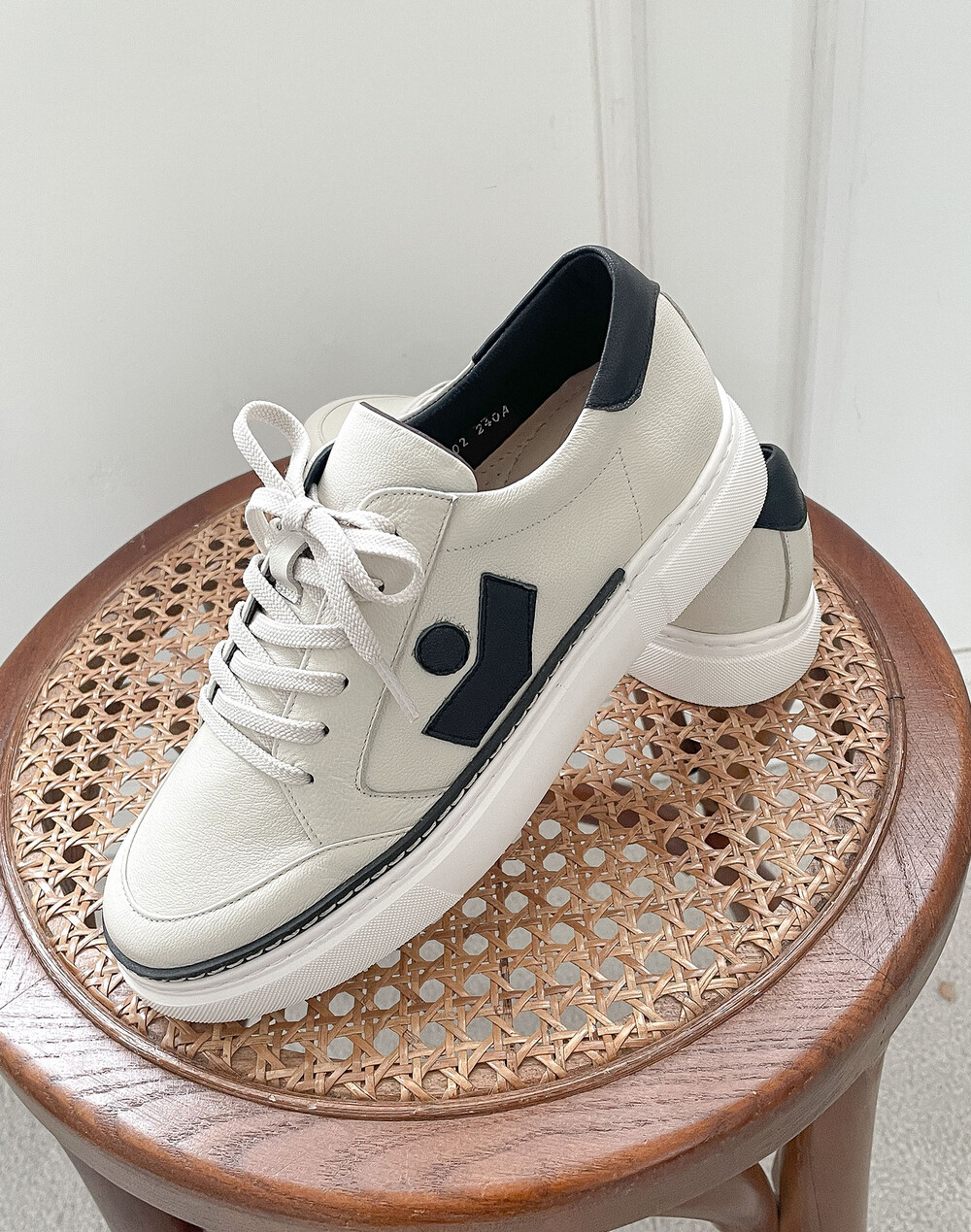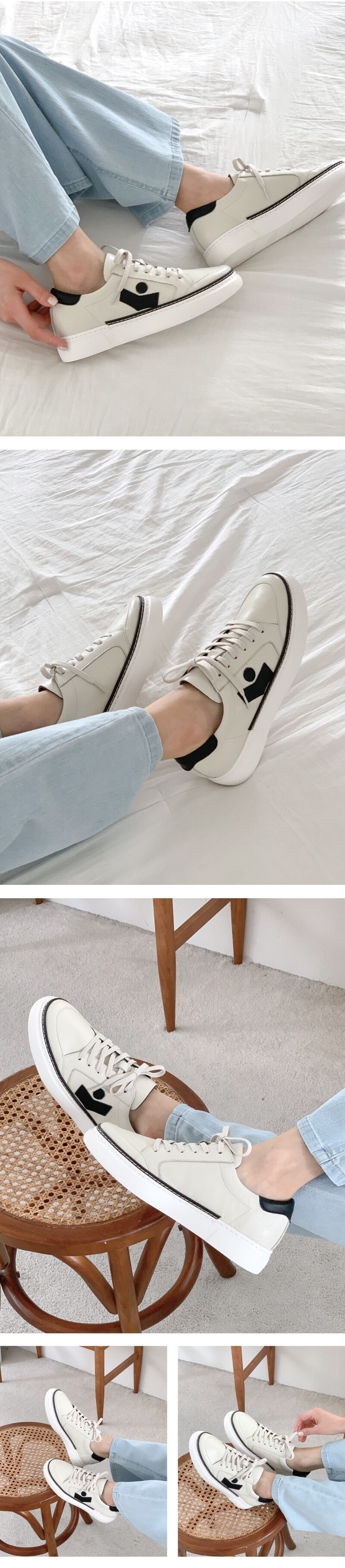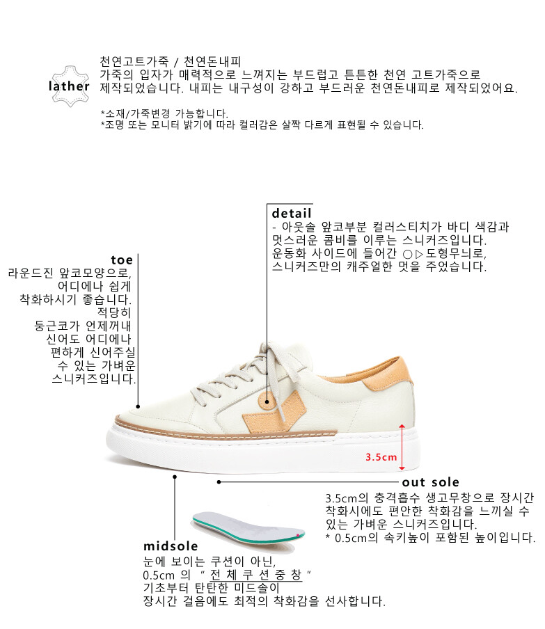 COMMENT 가죽의 입자가 매력적으로 느껴지는 부드럽고 튼튼한 천연 고트가죽으로 제작되었습니다. 내피는 내구성이 강하고 부드러운 천연돈내피로 제작되었어요. 라운드진 앞코모양으로, 어디에나 쉽게 착화하시기 좋습니다. 적당히 둥근코가 언제꺼내 신어도 어디에나 편하게 신어주실 수 있는 가벼운 스니커즈입니다. 아웃솔 앞코부분 컬러스티치가 바디 색감과 멋스러운 콤비를 이루는 스니커즈입니다. 운동화 사이드에 들어간 ○▷도형무늬로, 스니커즈만의 캐주얼한 멋을 주었습니다. 3.5cm의 충격흡수 생고무창으로 장시간 착화시에도 편안한 착화감을 느끼실 수 있는 가벼운 스니커즈입니다. * 0.5cm의 속키높이 포함된 높이입니다.