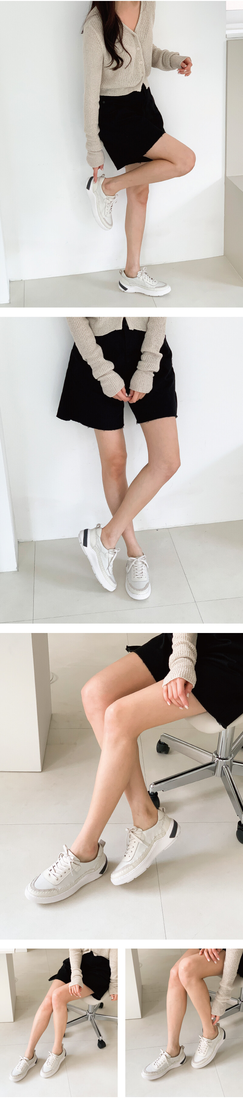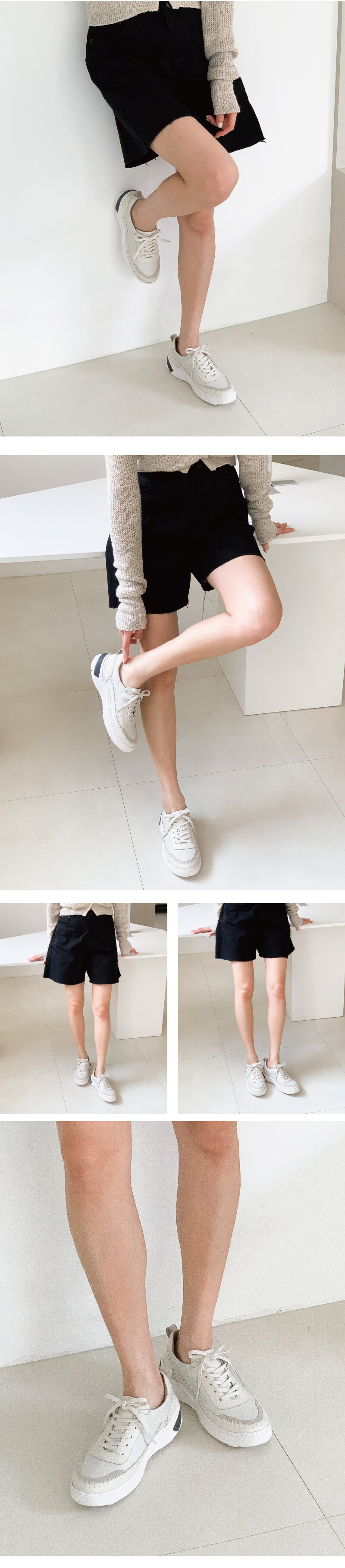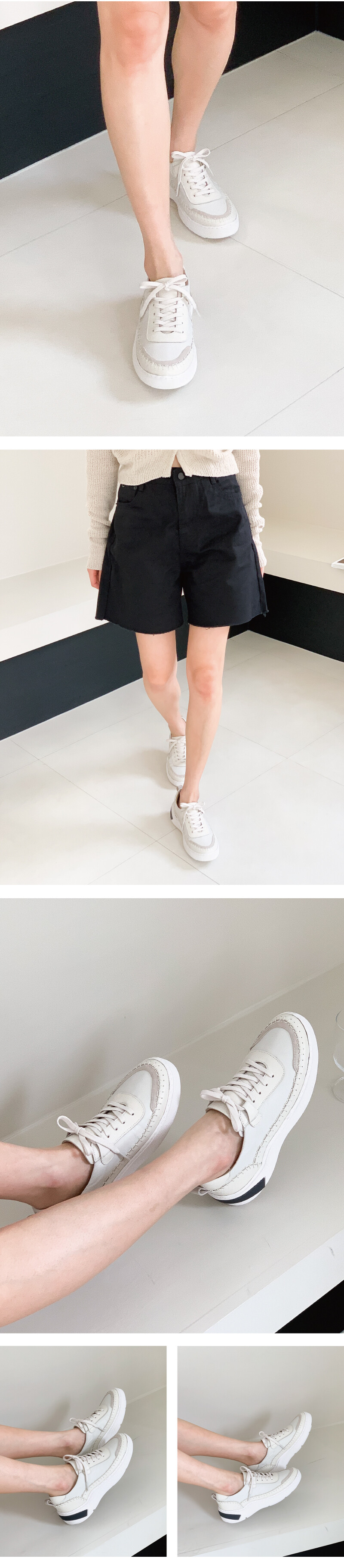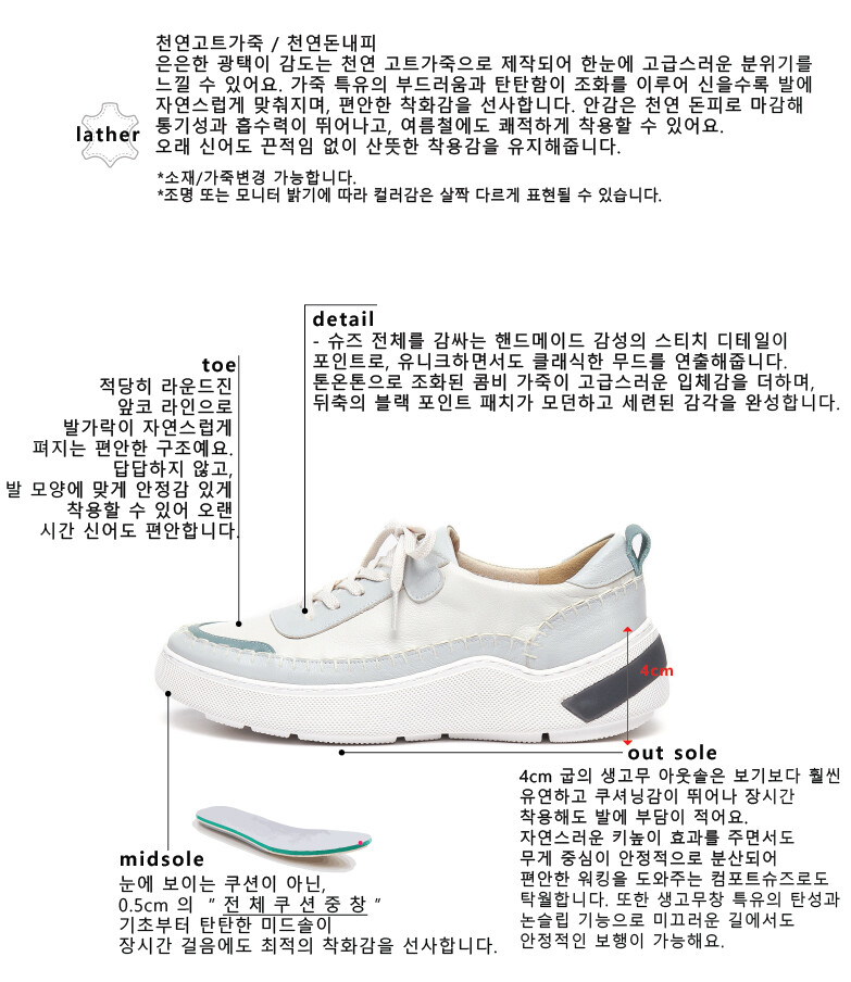 COMMENT 슈즈 전체를 감싸는 스티치 디테일로 클래식한 감성을 더한 스니커즈를 소개해드려요! 은은한 광택이 감도는 천연 고트가죽으로 제작되어 한눈에 고급스러운 분위기를 느낄 수 있어요. 가죽 특유의 부드러움과 탄탄함이 조화를 이루어 신을수록 발에 자연스럽게 맞춰지며, 편안한 착화감을 선사합니다. 안감은 천연 돈피로 마감해 통기성과 흡수력이 뛰어나고, 여름철에도 쾌적하게 착용할 수 있어요. 오래 신어도 끈적임 없이 산뜻한 착용감을 유지해줍니다. 적당히 라운드진 앞코 라인으로 발가락이 자연스럽게 펴지는 편안한 구조예요. 답답하지 않고, 발 모양에 맞게 안정감 있게 착용할 수 있어 오랜 시간 신어도 편안합니다. 슈즈 전체를 감싸는 핸드메이드 감성의 스티치 디테일이 포인트로, 유니크하면서도 클래식한 무드를 연출해줍니다. 톤온톤으로 조화된 콤비 가죽이 고급스러운 입체감을 더하며, 뒤축의 블랙 포인트 패치가 모던하고 세련된 감각을 완성합니다. 4cm 굽의 생고무 아웃솔은 보기보다 훨씬 유연하고 쿠셔닝감이 뛰어나 장시간 착용해도 발에 부담이 적어요. 자연스러운 키높이 효과를 주면서도무게 중심이 안정적으로 분산되어 편안한 워킹을 도와주는 컴포트슈즈로도 탁월합니다. 또한 생고무창 특유의 탄성과 논슬립 기능으로 미끄러운 길에서도 안정적인 보행이 가능해요.