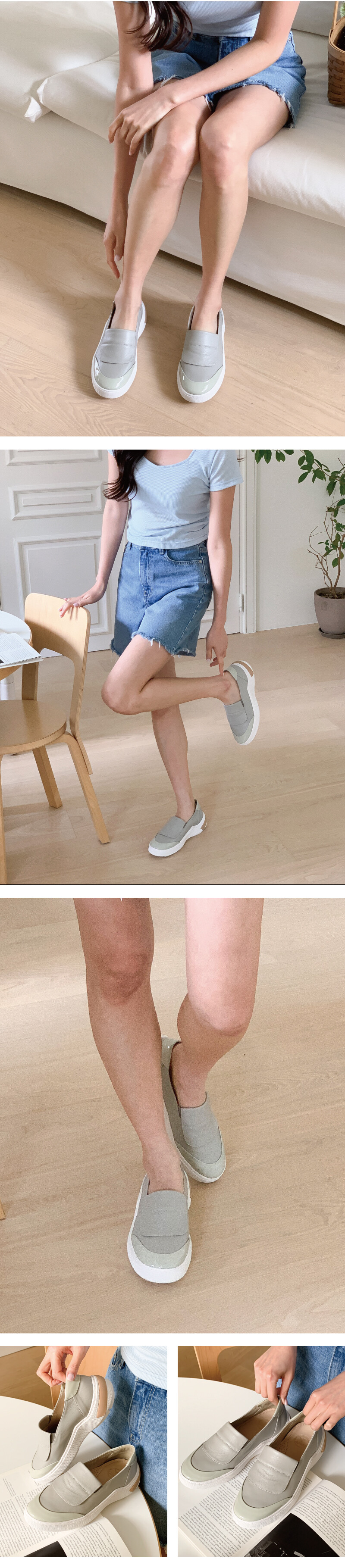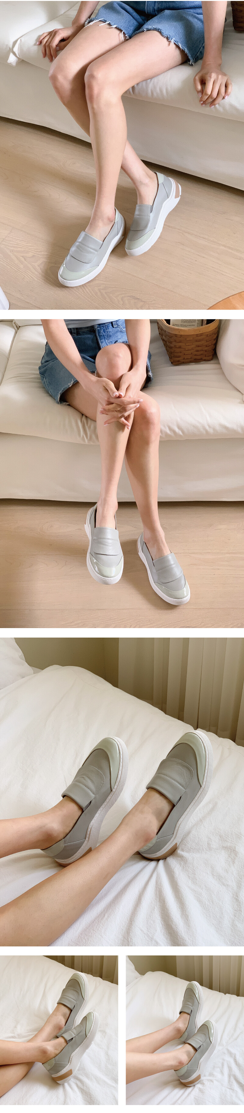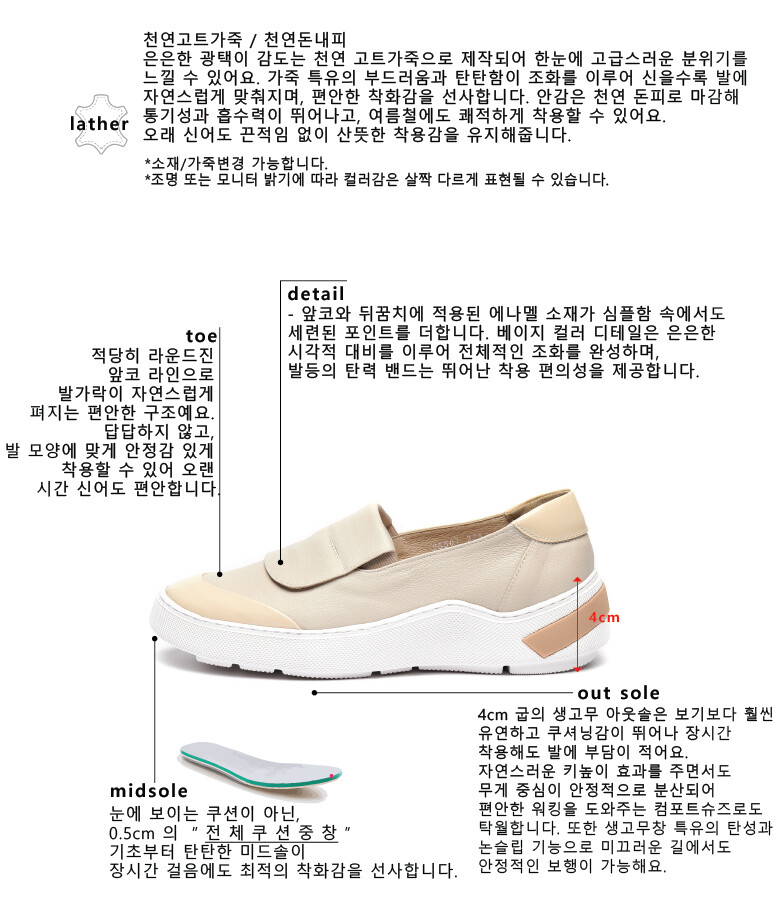 COMMENT 은은한 광택이 감도는 천연 고트가죽으로 제작되어 한눈에 고급스러운 분위기를 느낄 수 있어요. 가죽 특유의 부드러움과 탄탄함이 조화를 이루어 신을수록 발에 자연스럽게 맞춰지며, 편안한 착화감을 선사합니다. 안감은 천연 돈피로 마감해 통기성과 흡수력이 뛰어나 산뜻한 착용감을 유지해줍니다. 적당히 라운드진 앞코 라인으로 발가락이 자연스럽게 펴지는 편안한 구조예요. 답답하지 않고, 발 모양에 맞게 안정감 있게 착용할 수 있어 오랜 시간 신어도 편안합니다. 앞코와 뒤꿈치에 적용된 에나멜 소재가 심플함 속에서도 세련된 포인트를 더합니다. 베이지 컬러 디테일은 은은한 시각적 대비를 이루어 전체적인 조화를 완성하며, 발등의 탄력 밴드는 뛰어난 착용 편의성을 제공합니다. 4cm 굽의 생고무 아웃솔은 보기보다 훨씬 유연하고 쿠셔닝감이 뛰어나 장시간 착용해도 발에 부담이 적어요. 자연스러운 키높이 효과를 주면서도무게 중심이 안정적으로 분산되어 편안한 워킹을 도와주는 컴포트슈즈로도 탁월합니다. 또한 생고무창 특유의 탄성과 논슬립 기능으로 미끄러운 길에서도 안정적인 보행이 가능해요.