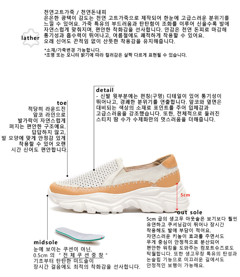 COMMENT 은은한 광택이 감도는 천연 고트가죽으로 제작되어 한눈에 고급스러운 분위기를 느낄 수 있어요. 가죽 특유의 부드러움과 탄탄함이 조화를 이루어 신을수록 발에 자연스럽게 맞춰지며, 편안한 착화감을 선사합니다. 안감은 천연 돈피로 마감해 통기성과 흡수력이 뛰어나고, 여름철에도 쾌적하게 착용할 수 있어요. 오래 신어도 끈적임 없이 산뜻한 착용감을 유지해줍니다. 적당히 라운드진 앞코 라인으로 발가락이 자연스럽게 펴지는 편안한 구조예요. 답답하지 않고, 발 모양에 맞게 안정감 있게 착용할 수 있어 오랜 시간 신어도 편안합니다. 신발 윗부분에는 펀칭(구멍) 디테일이 있어 통기성이 뛰어나고, 경쾌한 분위기를 연출합니다. 앞코와 옆면은 대비되는 색상의 소재로 포인트를 주어 입체감과 고급스러움을 강조했습니다. 또한, 전체적으로 둘러진 스티치 땀 수가 수제화만의 멋스러움을 더해줍니다. 5cm 굽의 생고무 아웃솔은 보기보다 훨씬 유연하고 쿠셔닝감이 뛰어나 장시간 착용해도 발에 부담이 적어요. 자연스러운 키높이 효과를 주면서도무게 중심이 안정적으로 분산되어 편안한 워킹을 도와주는 컴포트슈즈로도 탁월합니다. 또한 생고무창 특유의 탄성과 논슬립 기능으로 미끄러운 길에서도 안정적인 보행이 가능해요.
