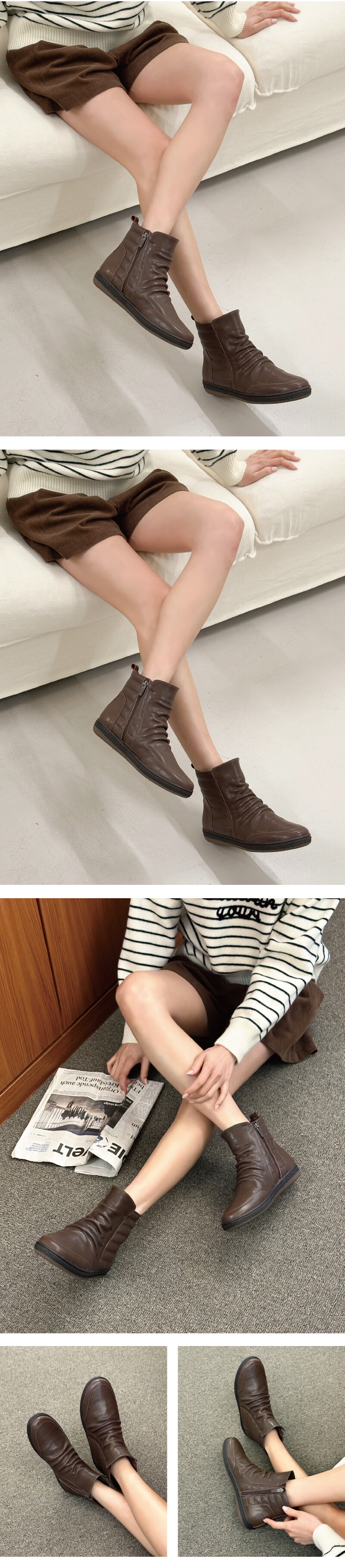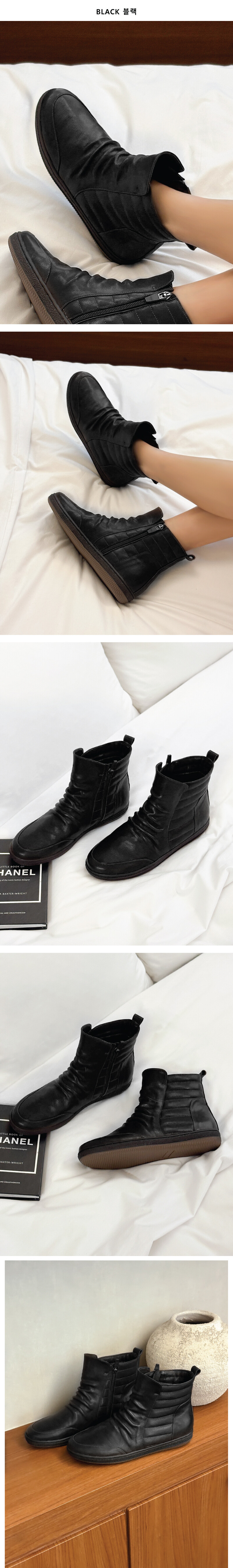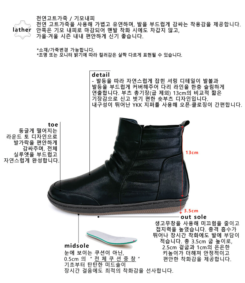 COMMENT 천연 고트가죽을 사용해 가볍고 유연하며, 발을 부드럽게 감싸는 착용감을 제공하는 앵클부츠입니다. 안쪽은 기모 내피로 마감되어 맨발로 착화해도 차갑지 않으며, 가을·겨울 시즌 내내 데일리로 신기 좋습니다. 발등을 따라 자연스럽게 잡힌 셔링 디테일이 발볼과 발등을 편안하게 커버해주고, 둥글게 떨어지는 라운드 토 디자인으로 전체 실루엣을 부드럽고 슬림하게 완성합니다. 부츠 총기장(굽 제외) 13cm의 숏부츠 기장으로 신고 벗기 편하며, 내구성이 뛰어난 YKK 지퍼를 적용해 오픈·클로징이 간편합니다. 아웃솔은 충격 흡수가 뛰어난 생고무창을 사용해 미끄럼을 줄이고 접지력을 높였으며, 2.5cm 겉굽과 1cm 키높이를 더한 총 3.5cm 굽 높이로 장시간 착화에도 부담 없이 안정적인 착화감을 제공합니다.