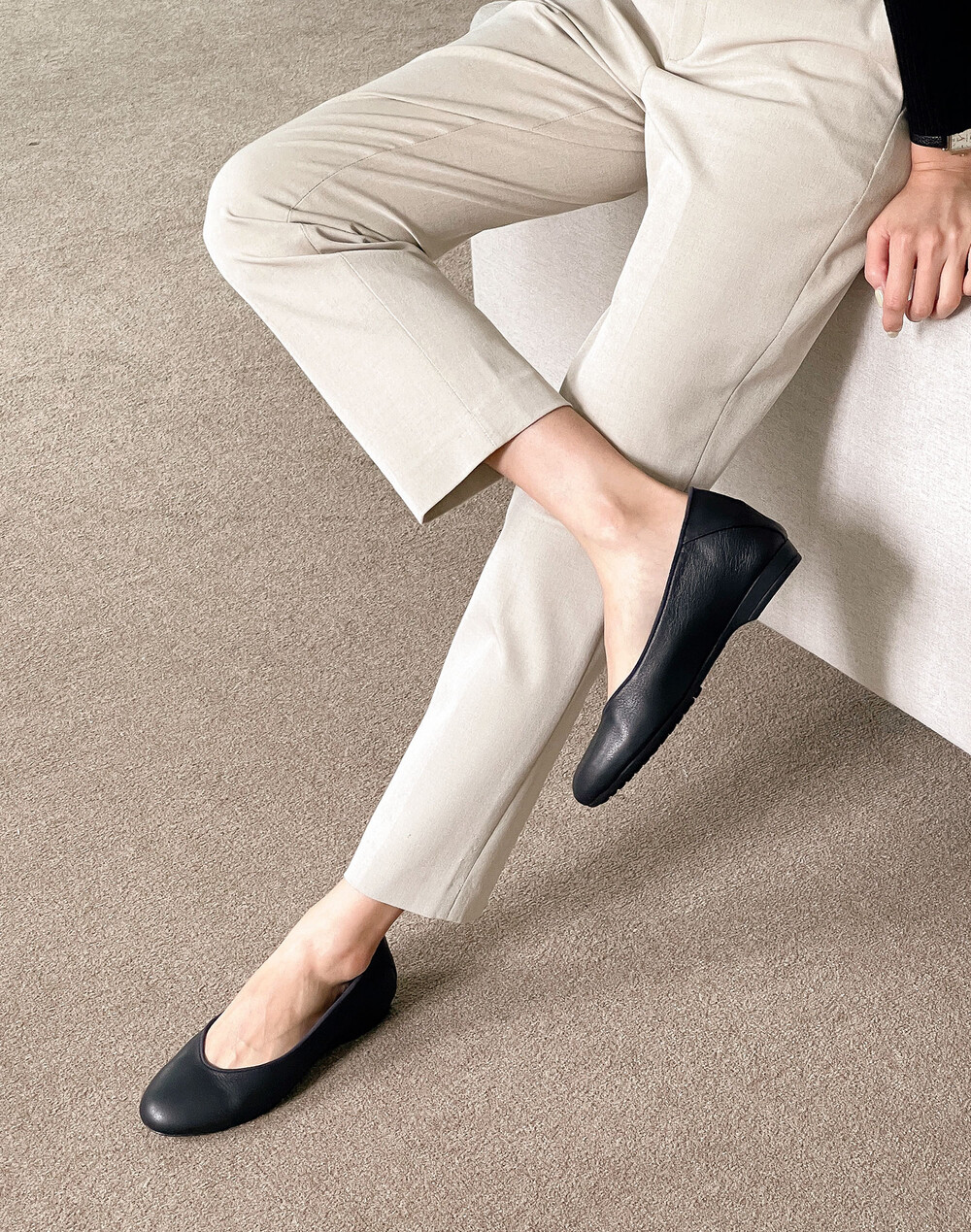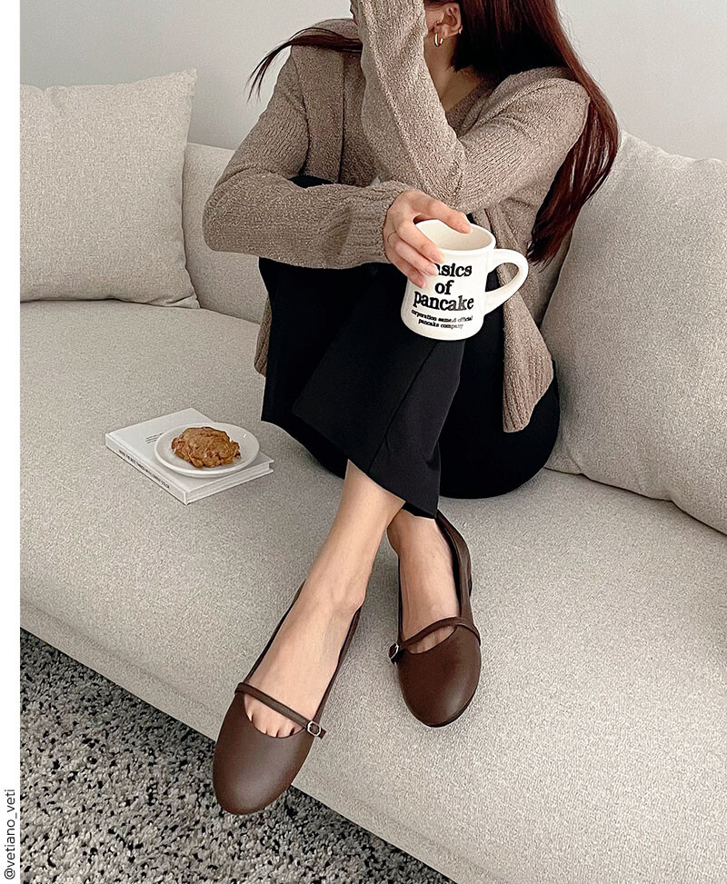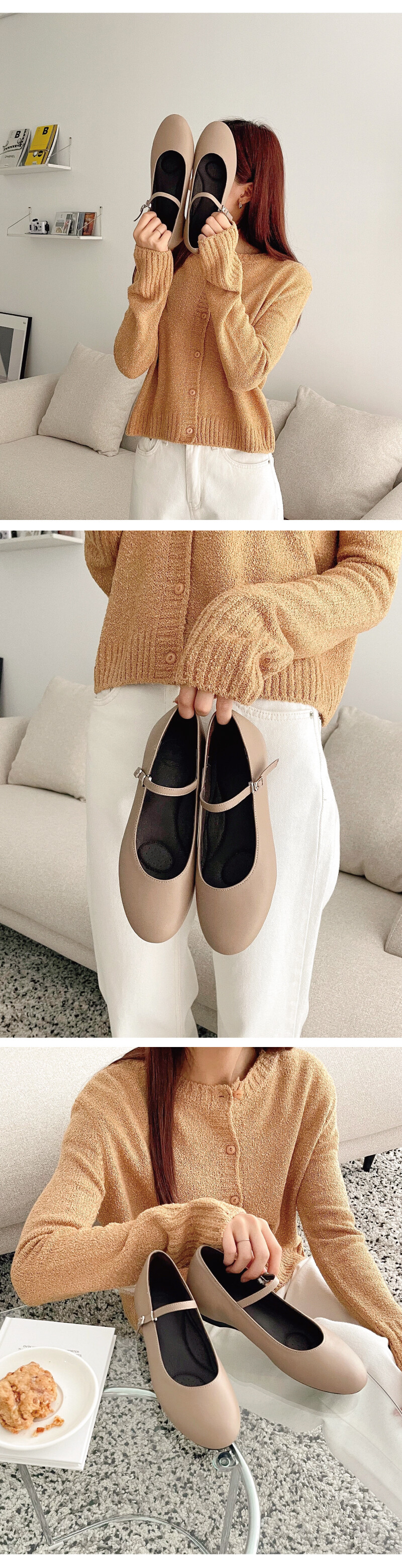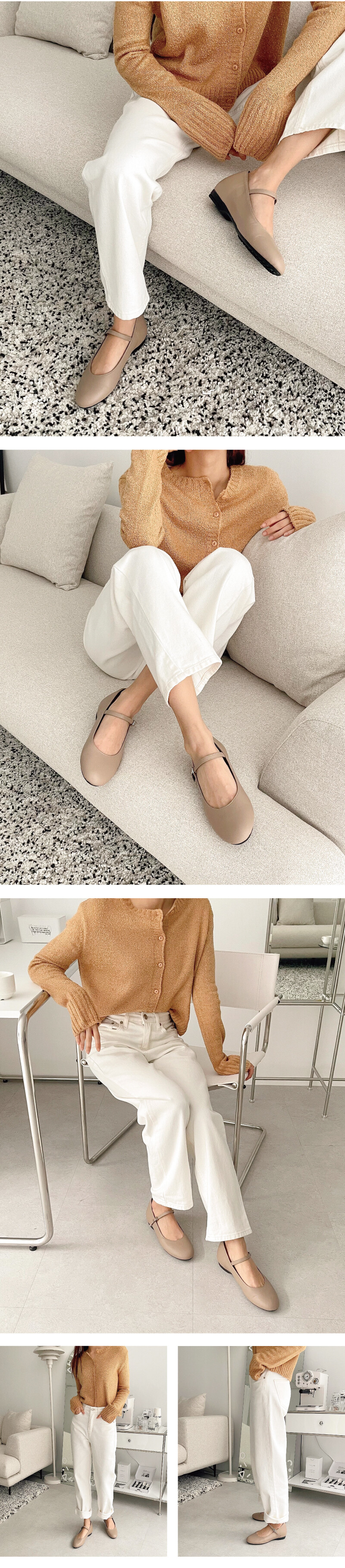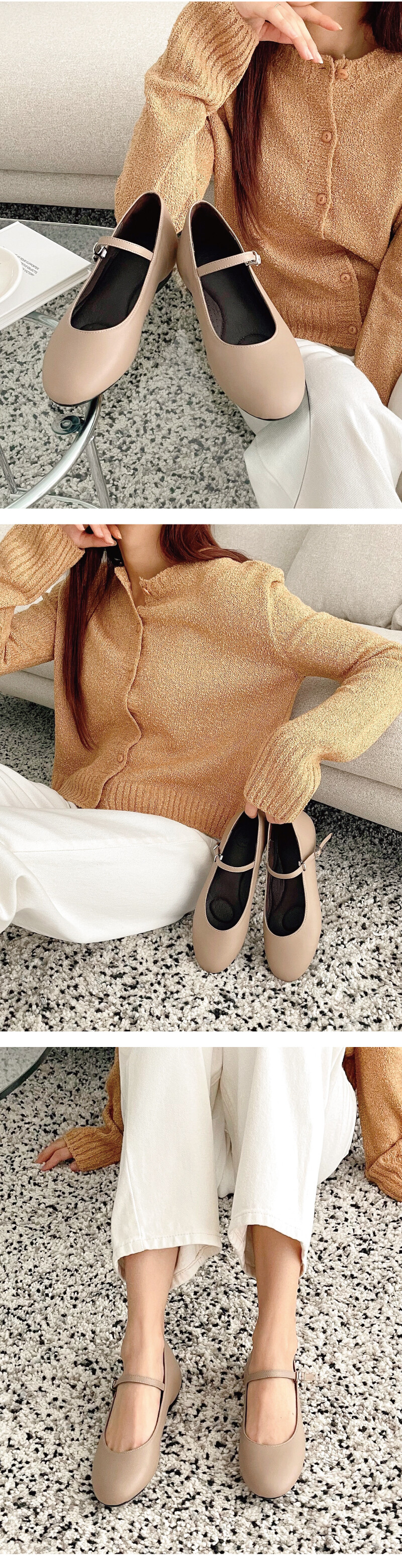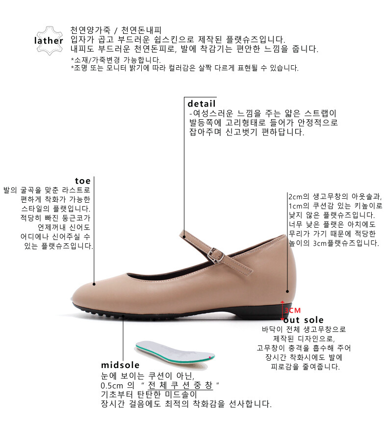 발등에 들어간 고리형태의 스트랩으로 여성스러운 느낌을 살린 메리제인 스타일의 플랫슈즈입니다. 착화감이 부드러우면서도 입자가 고운 천연 양가죽 소재로 제작되었습니다. 내피는 부드러운 천연돈피로 발에 착 감겨 편안한 느낌을 줍니다. 발편한 라운드 코모양으로, 발에 굴곡을 맞춘 라스트로 편하게 착화가 가능한 스타일의 플랫입니다. 적당히 둥근코가 언제꺼내 신어도 어디에나 편하게 신어주실 수 있는 플랫입니다. 여성스러운 느낌을 주는 얇은 스트랩이 발등쪽에 고리형태로 들어가 안정적으로 잡아주며 신고벗기 편하답니다. 눈에 보이는 쿠션이 아닌, 기초부터 탄탄한 전체쿠션을 써주어 장시간 걸음에도 최적의 착화감을 선사합니다. 바닥이 전체 생고무창으로 제작된 디자인으로, 고무창이 충격을 흡수해 주어 장시간 착화시에도 발에 피로감을 줄여줍니다. 2cm의 아웃솔 + 1cm의 속쿠션 2cm의 생고무창의 아웃솔과, 1cm의 쿠션감 있는 키높이로 낮지 않은 플랫슈즈입니다. 너무 낮은 플랫은 아치에도 무리가 가기 때문에 적당한 높이의 3cm플랫슈즈~ 추천해드릴게요!