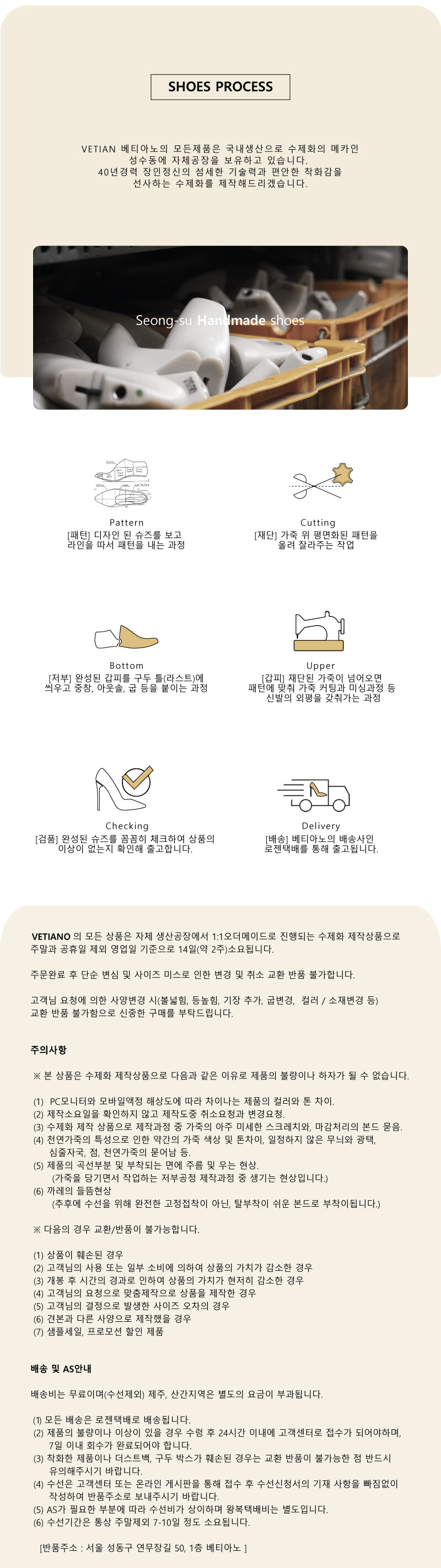 SIZE TIP : 정사이즈로 주문해주세요. 발볼이 넓은 고객님의 경우 꼭 "발볼넓힘"을 신청해주세요. 베티아노 모든슈즈는 1:1 order made 상품으로 구매전 담당 디자이너와의 상담을 통해 발에 맞는 사이즈를 제작해 드립니다.