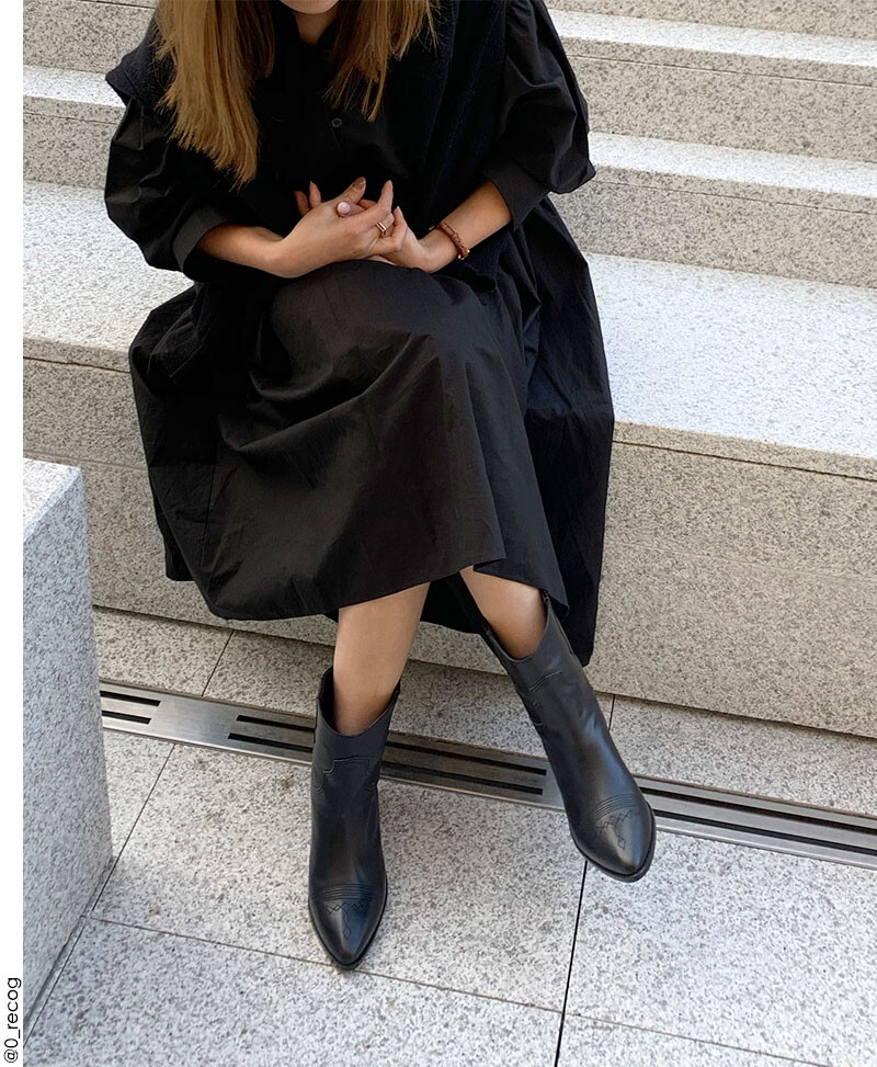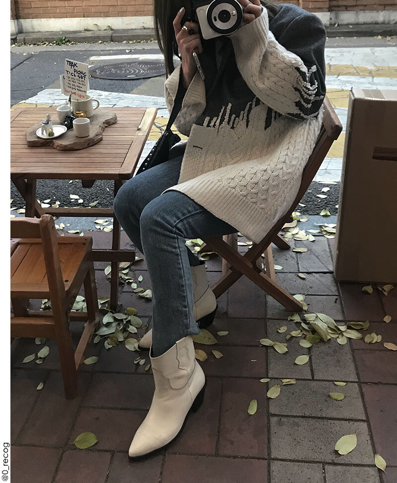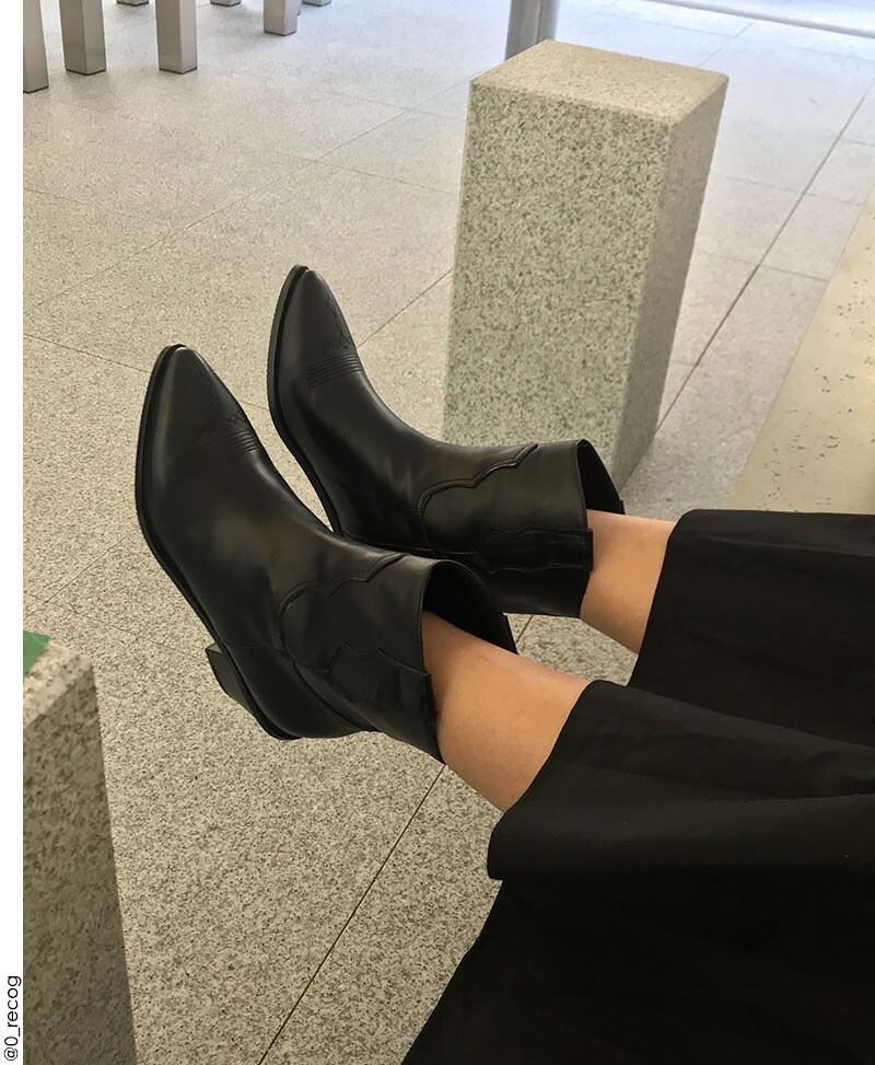 얄쌍하게 빠진 앞 코 모양과 앞코에 새겨진 문양이 포인트인 웨스턴 부츠입니다. 통이 넓직한 느낌의 카우보이 핏의 부츠 통으로 편안하게 신을 수 있습니다. 앞 코 부분엔 정성스럽게 한 땀 한 땀 무늬를 주어 웨스턴 부츠만의 유니크한 느낌을 한껏 살렸습니다. 바디보다 오버된 세피창으로 세련됨을 한층 더 높였으며 내려갈수록 얇게 빠지지만 적당한 두께감으로 트렌디함과 편안함을 느낄 수 있습니다.