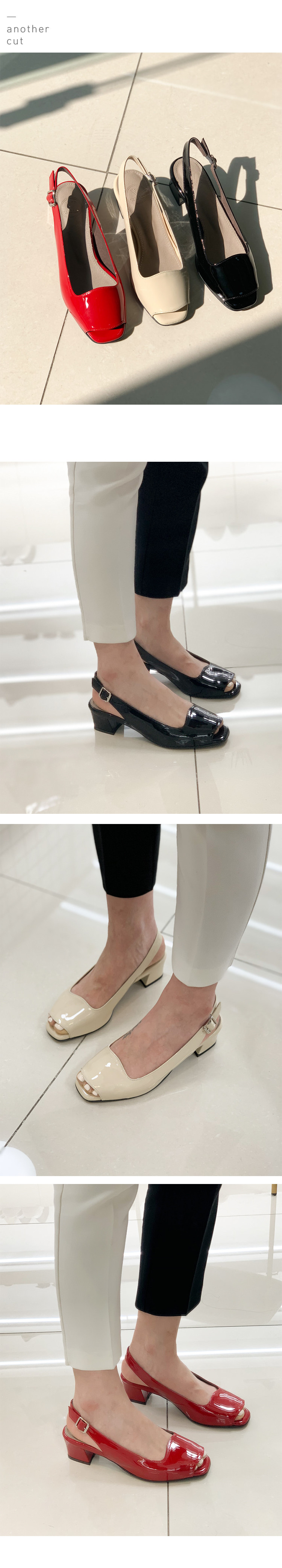 기본오픈토보다 발을 더 감싸주는 라인과 4cm의 사각굽으로 편하게 신어줄 수 있는 오픈토.