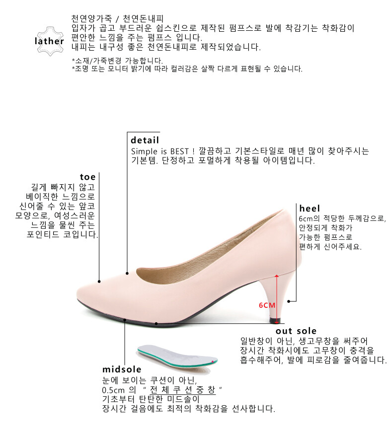COMMENT 생고무창의 바닥에 안정된 6cm의 힐굽으로 편하게 신어주세요~~!입자가 곱고 부드러운 쉽스킨으로 제작된 펌프스로 발에 착감기는 착화감이 편안한 느낌을 주는 펌프스 입니다. 내피는 내구성 좋은 천연돈내피로 제작되었습니다. 길게 빠지지 않고 베이직한 느낌으로 신어줄 수 있는 앞코 모양으로, 여성스러운 느낌을 물씬 주는 포인티드 코입니다. Simple is BEST ! 깔끔하고 기본스타일로 매년 많이 찾아주시는 기본템. 단정하고 포멀하게 착용될 아이템입니다. 6cm의 적당한 두께감으로, 안정되게 착화가 가능한 펌프스로 편하게 신어주세요. 일반창이 아닌, 생고무창을 써주어 장시간 착화시에도 고무창이 충격을 흡수해주어, 발에 피로감을 줄여줍니다.