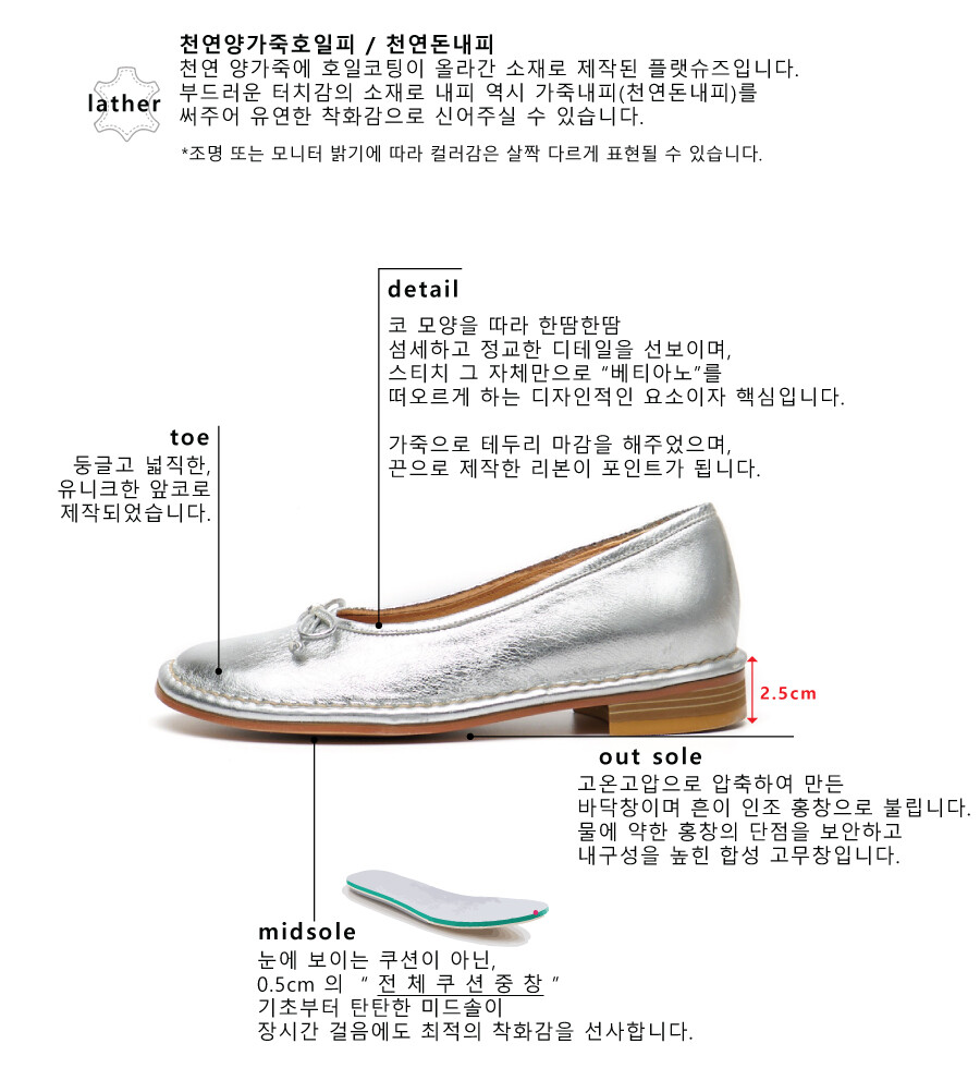 천연 양가죽에 호일코팅이 올라간 소재로 제작된 플랫슈즈입니다. 부드러운 터치감의 소재로 내피 역시 가죽내피(천연돈내피)를 써주어 유연한 착화감으로 신어주실 수 있습니다. 베티아노SE 만의 클래식하고 유니크한 무드와 함께 준비해보세요. 완성도 있는 마무리와, 고급스러운 소재 그리고 오랜 경력의 생산라인과 함께 섬세하고 정교한 디테일을 선보이며, 스티치 그 자체만으로 "베티아노"를 떠오르게 하는 디자인적인 요소이자 핵심입니다.