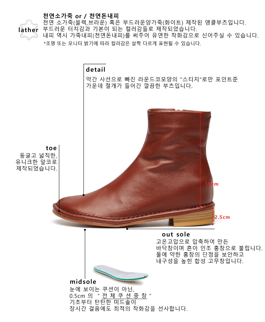 천연 소가죽(블랙,브라운) 혹은 부드러운양가죽(화이트) 제작된 앵클부츠입니다. 부드러운 터치감과 기본이 되는 컬러감들로 제작되었습니다. 내피 역시 가죽내피(천연돈내피)를 써주어 유연한 착화감으로 신어주실 수 있습니다. 굽제외 총기장 15cm의 기본기장으로 제작되었습니다. 베티아노SE 만의 클래식하고 유니크한 무드와 함께 준비해보세요. 완성도 있는 마무리와, 고급스러운 소재 그리고 오랜 경력의 생산라인과 함께 섬세하고 정교한 디테일을 선보이며, 스티치 그 자체만으로 "베티아노"를 떠오르게 하는 디자인적인 요소이자 핵심입니다.