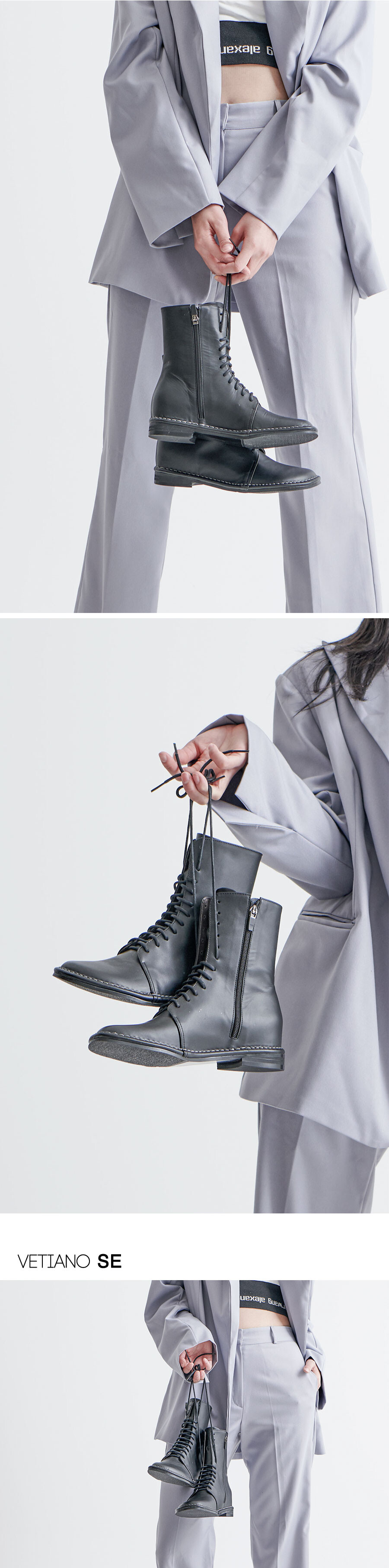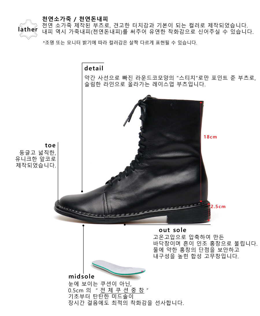 '베티아노SE'만의 수 공법으로 제작된 레이스업 워커부츠입니다. 약간 사선으로 빠진 라운드코모양의 "스티치"로만 포인트주었으며, 내구성 좋은 ykk지퍼 사이드 지퍼 디테일로 오픈/클로징 할 수 있어 편하답니다.